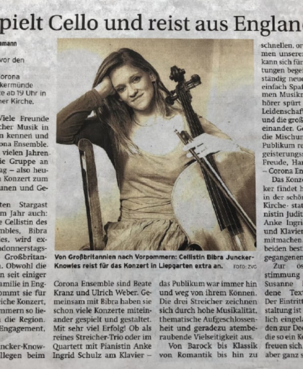 Whilst living in Germany I have been playing as part of the Corona Ensemble performing string quartets, trios and solo’s for concerts, accompanying choirs, functions and occasions in the surrounding area.